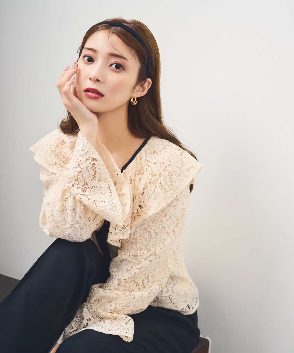 プロポーションオリジナル素材で仕上げたレースブラウス。お顔まわりを華やかに見せてくれる、ビッグカラーがポイントです。バイカラーの細リボンも品よく映えるアクセントに。身頃にはシフォン素材の裏地をつけています。裾をボトムスインした時にもたつかないようダーツを入れているため、すっきりスタイルアップが狙えます。