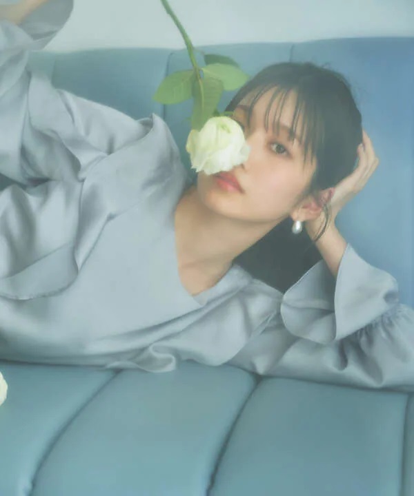 テクニック要らずで可愛く決まるフリルブラウス。首もとは深めのVネックにし、甘い印象のフリルを大人っぽく見せてくれるポイント。衿と裾にランダムな消しプリーツをかけることで甘くなりすぎず、抜け感のあるデザインに仕上げました。衿のフリル端は配色メローで締め、袖はタックを入れてボリュームスリーブに。ウエストは後ろがゴムなのでラクな着心地ながら、腰の位置を高く見せてくれます。