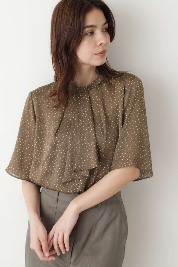 細かな三角模様の幾何学柄が新鮮な印象のプルオーバーブラウス。生地はソフトなタッチで、やや表面感があるのでさらりとして着心地のよい風合いです。スタンドカラーにボウティティール、ひらりと広がるフレアスリーブなど上品でクラシカルなデザインが魅力。1枚で華やかに決まる優秀アイテムです。バックネックファスナー開き。