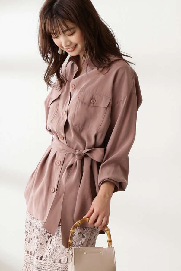 秋らしいピーチ素材を使用したベルト付サファリシャツです。共布ベルトでウエストマークをするとミディ丈のスカートともバランスよく決まります。ミリタリーやCPOジャケットライクなポケットディテールがアクセントに。今季らしいニュアンスカラーもポイントです。【スタイリング】パンツスタイルはもちろん、共布ベルトをキュッと締めてフレアスカートやレーススカートなど女性らしいアイテムと合わせても可愛いです。後ろに衿を抜いたり、袖口をたくし上げると女性らしいバランスに。