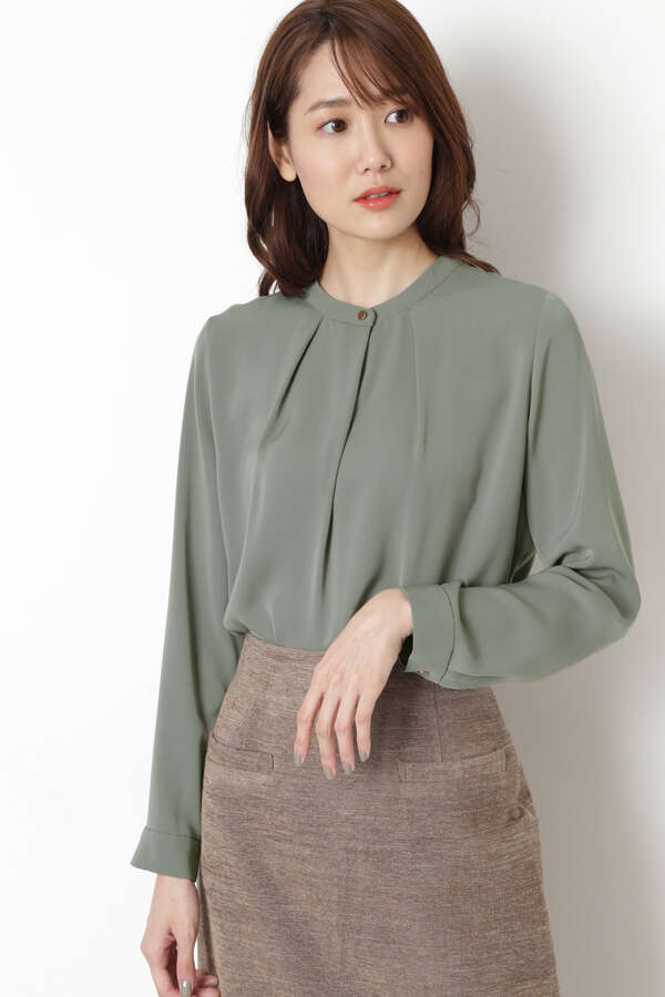ネックと袖口にあしらったゴールドボタンがポイントのプルオーバーブラウス。今年らしい首の詰まったデザインに、タックを入れることでシルエットに立体感をプラスしました。シックでスタイリッシュなブラウスは、1枚着としてはもちろん、ジャケットインにもおすすめです。