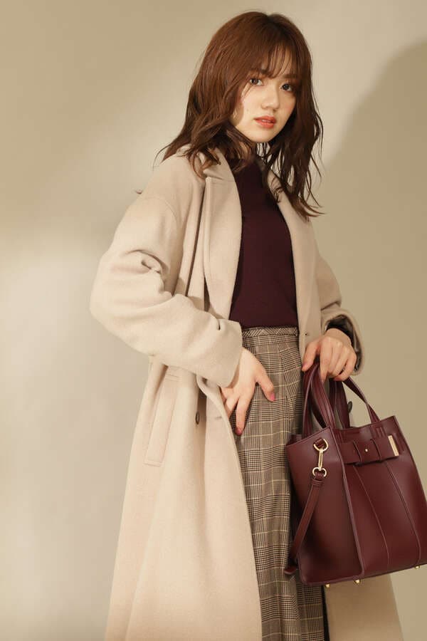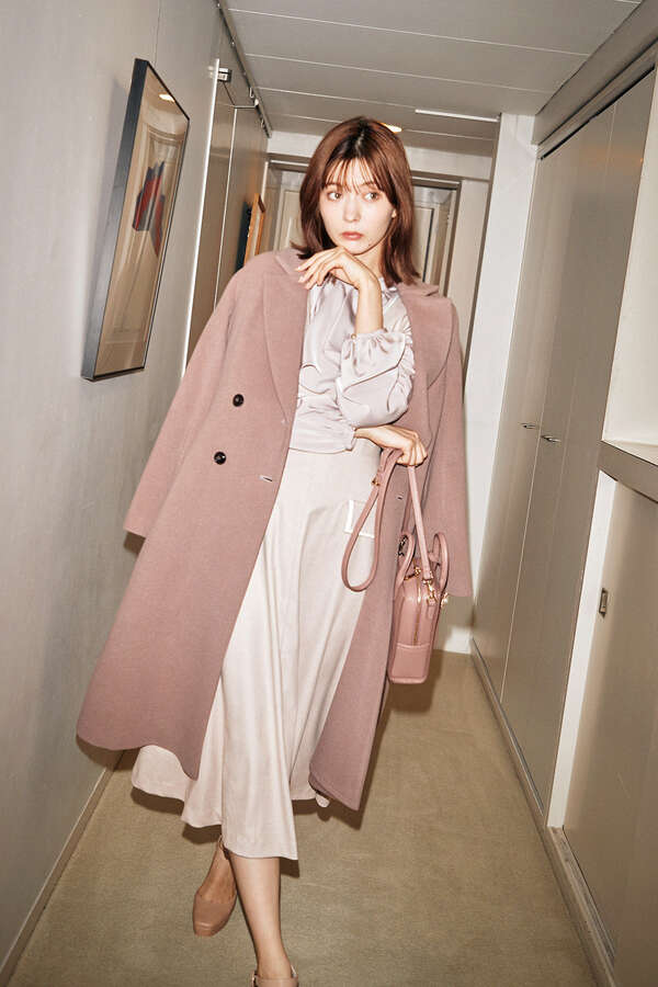 今年注目のビッグカラーチェスターコートです。すっきり開いたネックライン、ダブル釦、ボディラインをカバーするシルエットで大人な印象を演出。バックスタイルは共布ベルトを釦でつけて後ろ姿もアクセントをプラス。女性らしいニュアンス感あるカラーと暖かみのある素材を使用しており冬アウターにぴったりな一着です。