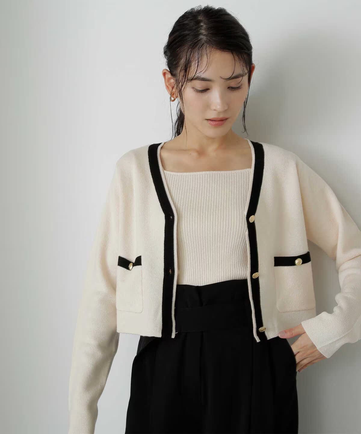 アイボリー×クロ: カーディガン:ポリエステル 53% アクリル 21% ナイロン 20% 毛 6%、インナー: ポリエステル 43% ナイロン 35% アクリル 17% 毛 5%