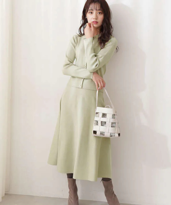 単品使いも可能なので、お手持ちの無地やレース、チェック柄スカートと合わせられます。セットアップでニットワンピース風コーディネートが時短で完成します。