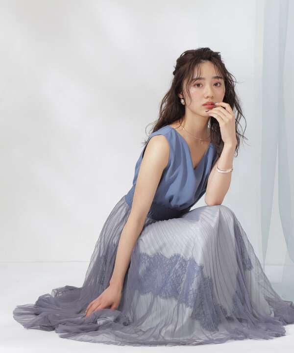 ふわっと広がるプリーツチュールから、さりげなく見えるレースデザインがエレガントなドレスです。トップスはシンプルなデザインなのでアクセサリーを選ばず着用できます。ウエストのシャーリングデザインですっきり見せてくれて品よくスタイルアップを期待できます。