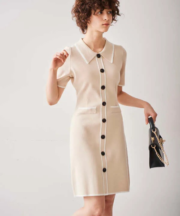 今季トレンドのディテール盛り込んだ衿付ニットワンピース。衿、フロント、ポケット口に配色をつけて、レトロガーリーな印象に仕上げました。着用するだけでキレイなシルエットを演出できるように、ウエストにくびれを作ったIラインのシルエットです。総針編みなのでしっかりした厚みがあり、1枚でも安心して着られます。