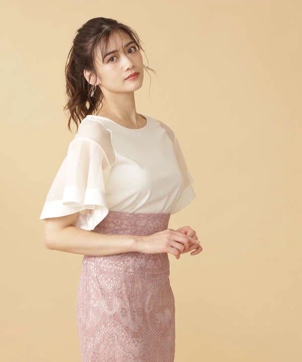 ブラウス見えする上品なラッフルスリーブトップス。透け感のあるラッフルスリーブがデザインポイントで、ふんわりと二の腕をカバーしてくれます。身頃はカットソー素材、袖はマットなオーガンジーをワントーンでドッキングして大人レディな表情を演出。レースタイトスカートやマーメイドラインのスカートにインしてお腹まわりをすっきり見せるのがおすすめです。