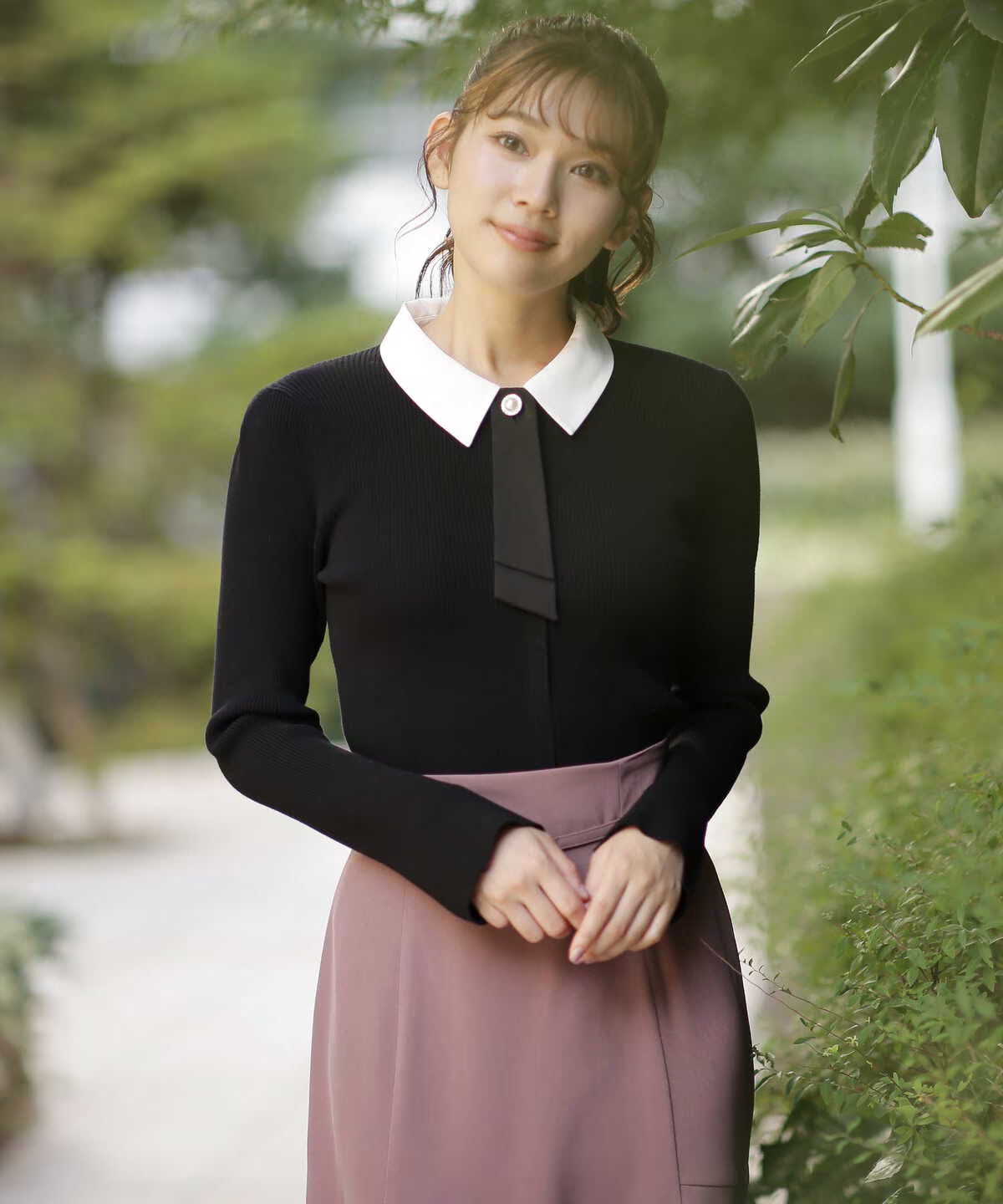 配色の襟とタイが大人のきちんと感を演出するニットトップス。伸縮性のあるリブニットで程よいフィット感あり、ソフトな着心地と肌触りが魅力。クラシカルな白襟で品よく見せながら、ロングスカートやミニスカートは勿論、パンツコーデともオンオフで着まわせます。襟とタイは取り外し可能。
