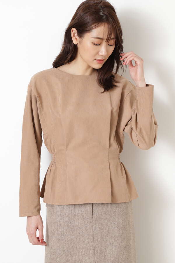 ドルマンスリーブでややリラックス感のあるシルエットに仕上げたペプラムブラウス。両サイドはゴムシャーリング仕様だから、きれいなシルエットを保ったまま楽ちんに着られるのが嬉しい。ほんのり起毛がかったピーチ素材は、秋冬のトレンドスタイリングにもぴったりなアイテムです。