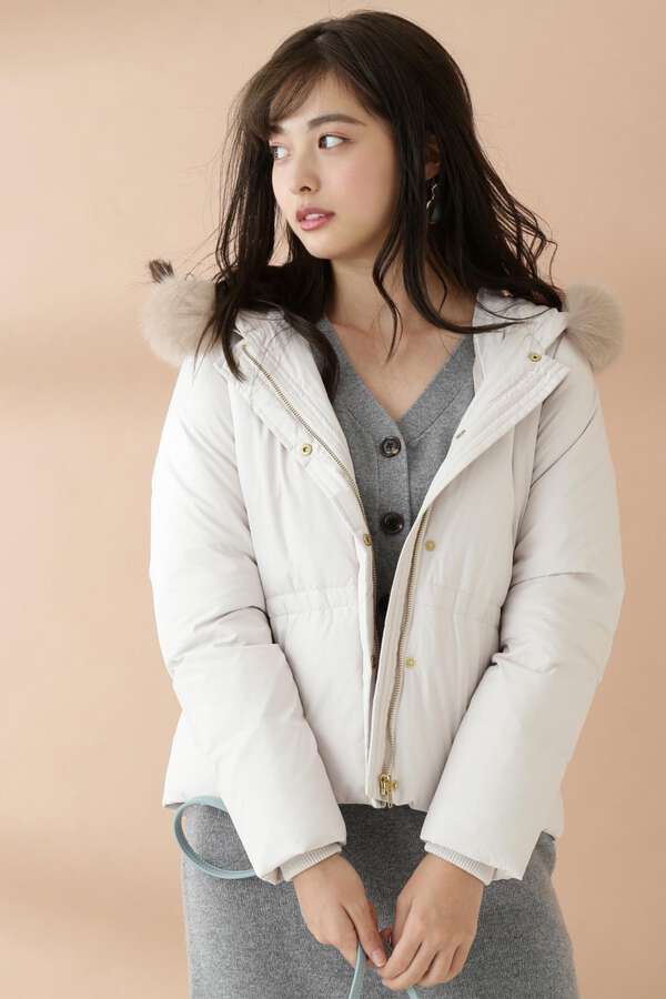 アイボリー: (表生地)ポリエステル 100%(取りはずし部分)フォックス(リブ部分)ポリエステル 97% ポリウレタン 3%(詰物)ダウン 80% フェザー 20%(裏生地)ポリエステル 100%