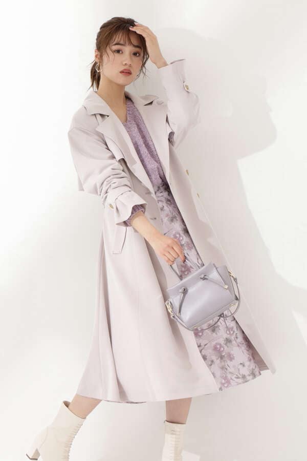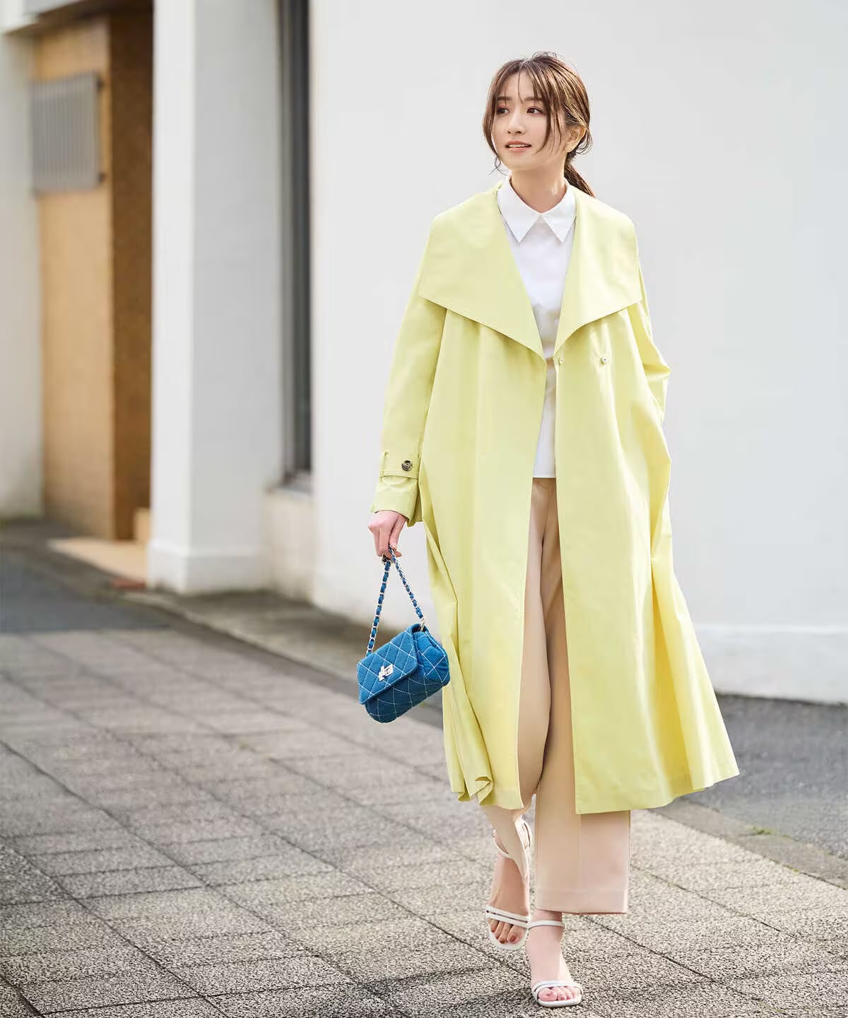 【スタイリング】内側のドローストリングでウエストマークし、襟を抜いて着るとこなれ感を演出できます。定番お通勤スカートはもちろん、トレンドのナロースカート合わせもおすすめです。
