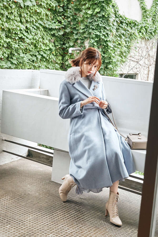 今年注目のビッグカラーチェスターコートです。すっきり開いたネックライン、ダブル釦、ボディラインをカバーするシルエットで大人な印象を演出。バックスタイルは共布ベルトを釦でつけて後ろ姿もアクセントをプラス。女性らしいニュアンス感あるカラーと暖かみのある素材を使用しており冬アウターにぴったりな一着です。